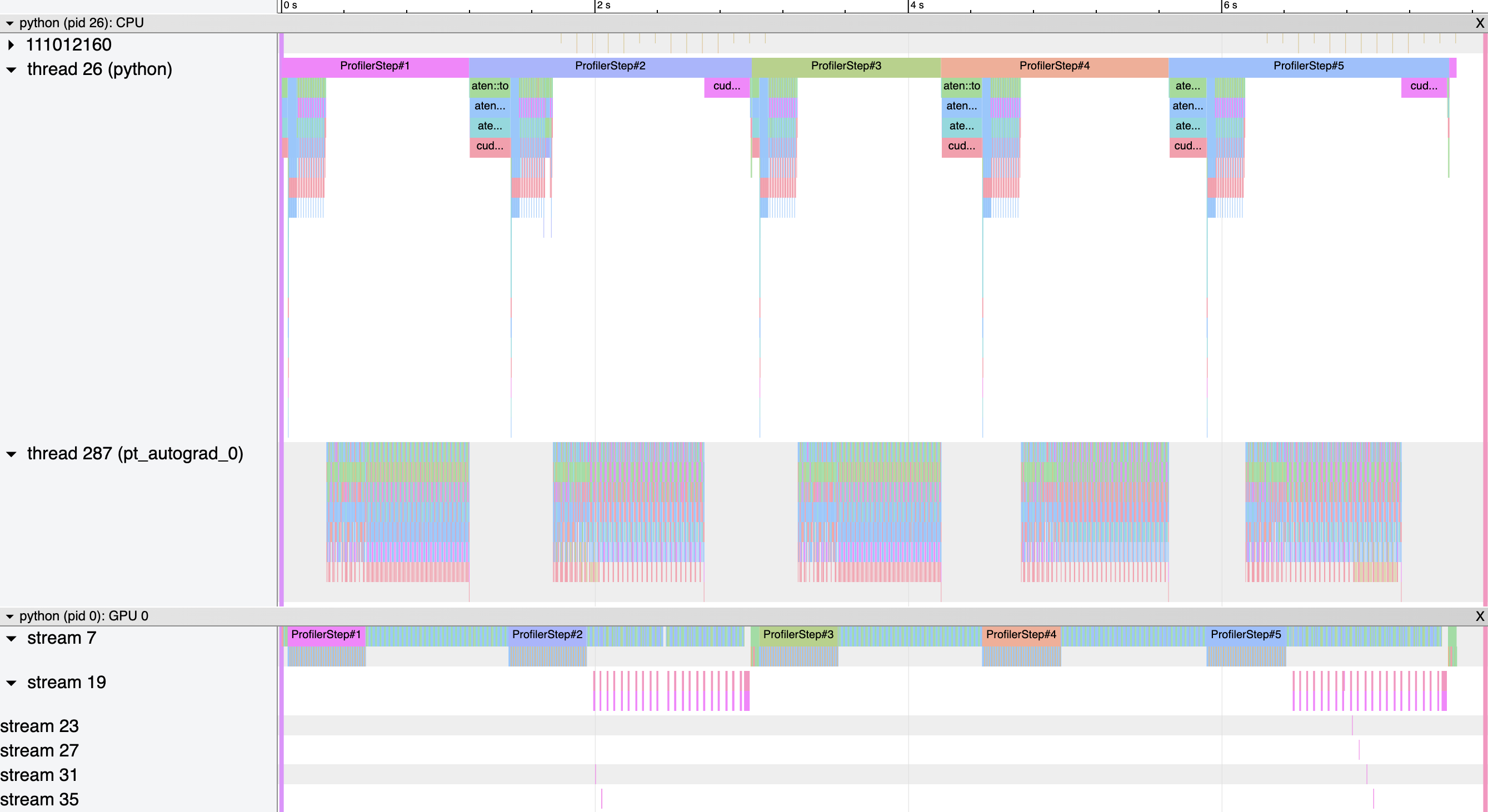 Similarly to our hook example when we compared synchronous and asynchronous communications, we see the second stream where our all_reduce operation executes without blocking the gradient computation. Like before, we can zoom into the GPU streams in the embedded trace viewer to see the difference between the blocking, synchronous all_reduce in the prevoius example and the non-blocking, asynchronous all_reduce in this example.