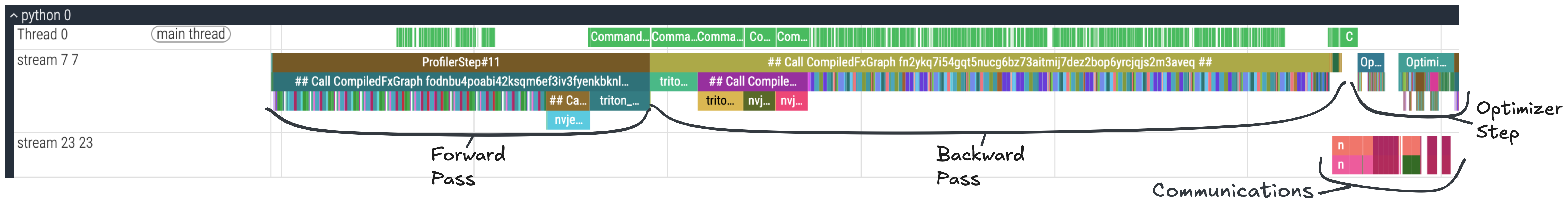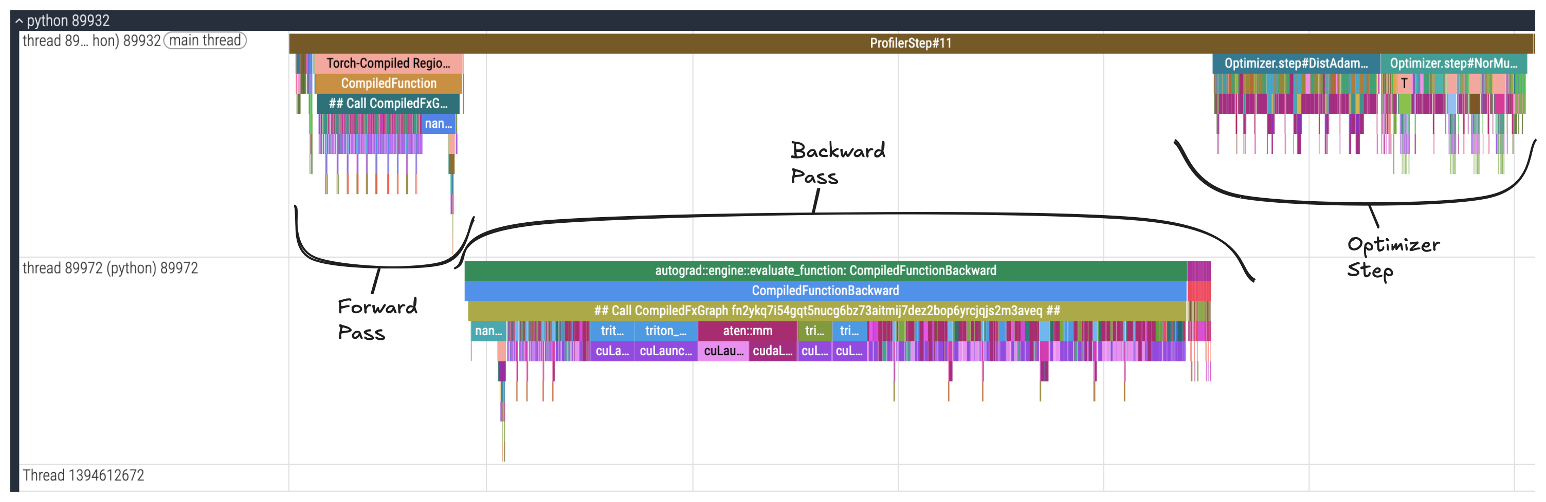 The image above is annotated to show the different phases of a training step. There's the forward and backward passes and the optimizer step where the gradients are used to update the weights.