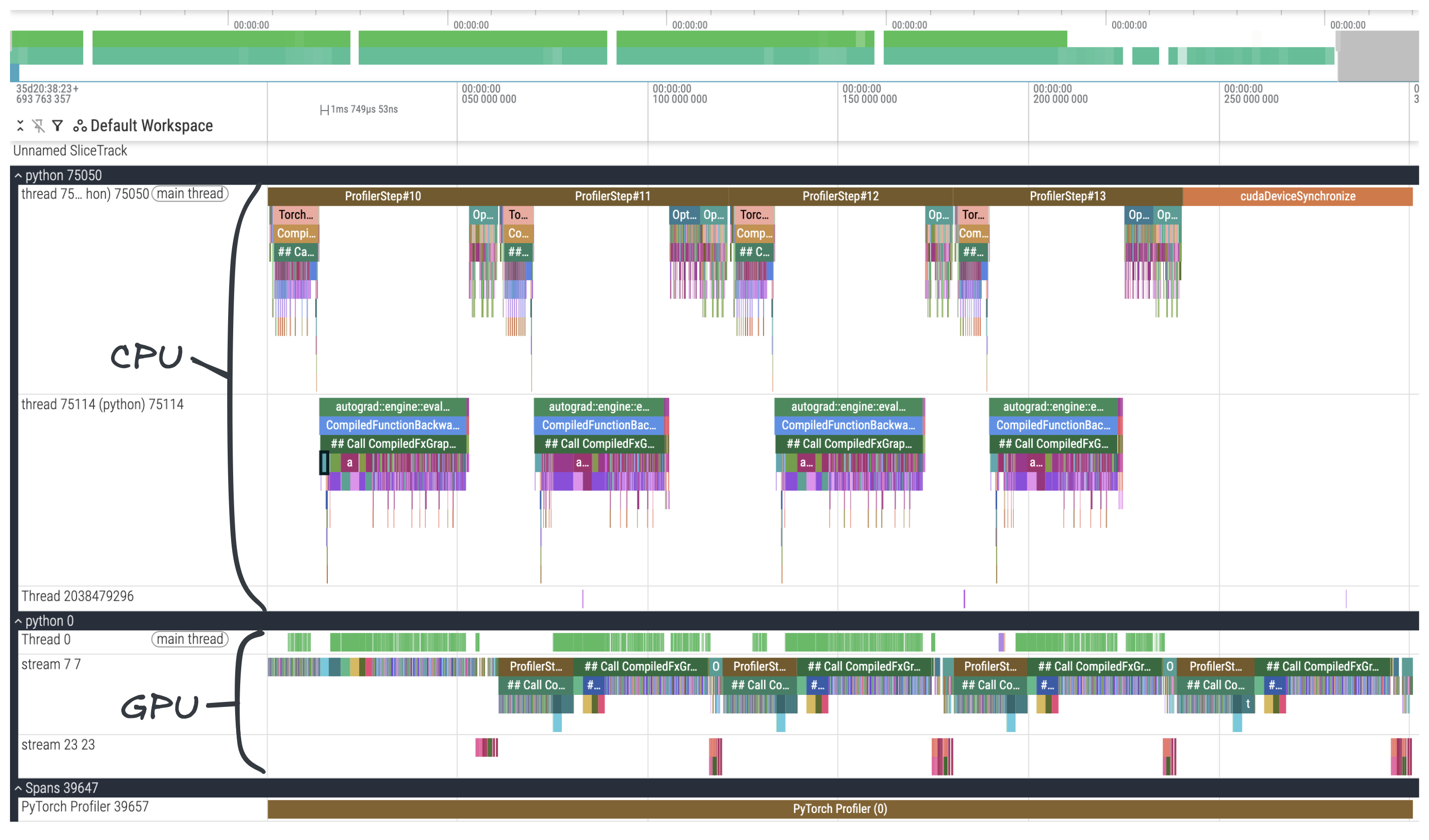 The files generated by tensorboard_trace_handler can also be used to visualize the profiler trace as we did previously using either chrome://tracing or the Perfetto UI.
