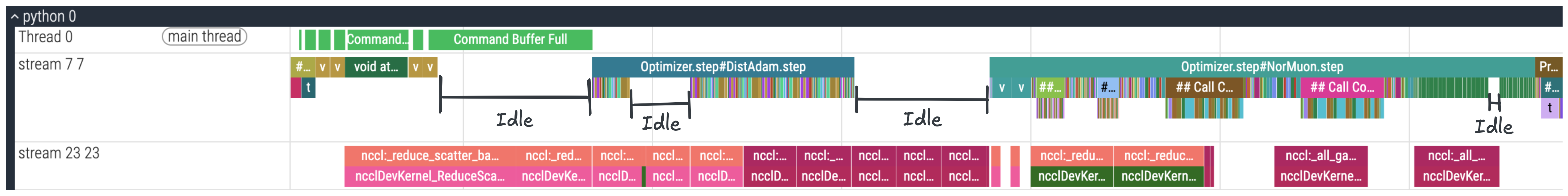 Just below the main GPU stream there are a few other slices on a separate stream. Modded-NanoGPT uses asynchronous communication operations which run on this separate GPU stream. In some places we can see that the communication slices overlap with computation slices in the main GPU stream above. Communications have latency and this overlap improves performance by keeping the GPU busy with computations instead of waiting idly for communications to complete.